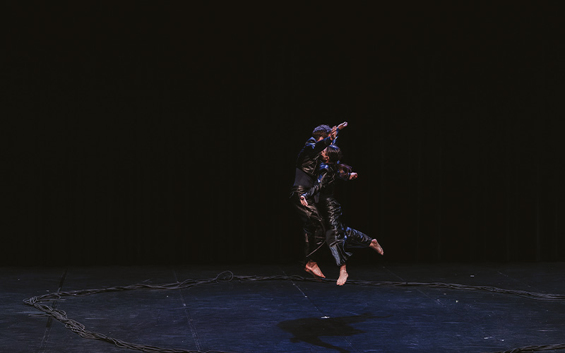Dans une gestuelle fulgurante, acrobatique et féline, deux individus habillés de cuir noir s’entrechoquent et s’accompagnent dans un espace restreint.
